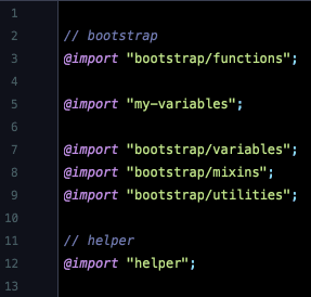 V prvom rade si vytvoríme scss súbor. Nazveme ho napríklad _helper.scss. Importovaný musí byť tak, aby compiler scss mal prístup k vygenerovaným funkciám, premenným, mixinom a utilitám, ktoré Bootstrap používa pre generovanie css.